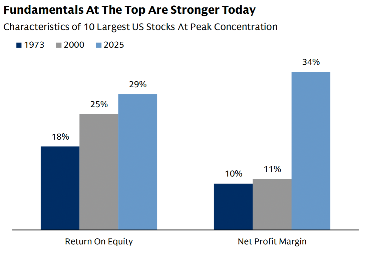 Today, the largest U.S. companies are highly profitable, cash-rich, and deeply integrated into the global economy. They are not the speculative start-ups of 1999. As the chart below shows, the ten largest U.S. companies (nearly all Tech companies) now operate with an average return on equity of 29% and net profit margins of 34% (blue bars), both materially stronger than the levels seen during prior episodes of peak market concentration, and notably better than in 2000 when the tech bubble burst (gray bars).