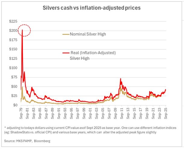 Bei dem Chart unten ist zu beachten, dass er nicht inflationsbereinigt ist. Silber notiert inflationsbereinigt also immer noch weit unter dem Stand von 1979.