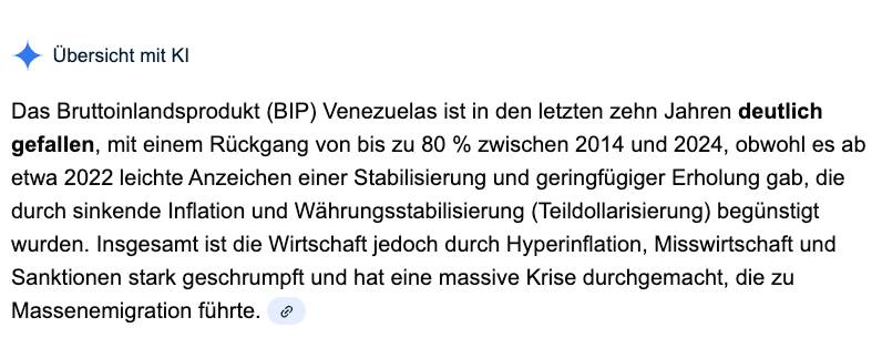 Wie in allen populistisch regierten Ländern (rechts- wie linkspopulistisch) werden Stellen in Venezuela in der Regel für verdiente Anhänger vergeben und nicht für die am besten qualifizierten Bewerber. Das führt beinahe immer zu wirtschaftlichen Verlusten – manchmal nur bezogen auf die Höhe des Wachstums (es fällt geringer aus), manchmal aber sinkt der Wohlstand eines Landes auch in absoluten Zahlen. Im Fall von Venezuela ist das Bruttosozialprodukt in den letzten zehn Jahren sehr deutlich gefallen.