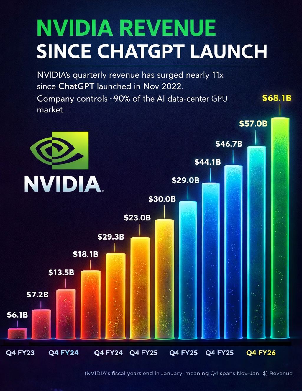 Natürlich kann der Umsatz von Nvidia noch weiter wachsen. Auf 80 Mrd. Dollar im Quartal. Oder auf 100 Mrd. Dollar im Quartal. Wie wahrscheinlich das ist? Ich kann es nicht beurteilen. Ich fürchte, niemand kann es sagen. Die Zukunft ist unsicher.